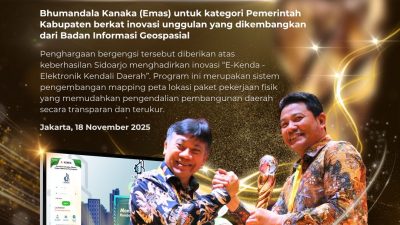 SIDOARJO, BARMIDNEWS – Pemerintah Kabupaten Sidoarjo kembali mencatatkan prestasi di tingkat nasional. Pada Selasa, (18/11) Kabupaten Sidoarjo dianugerahi penghargaan Bhumandala Kanaka (Emas) untuk kategori Pemerintah Kabupaten atas inovasi dari Badan Informasi Geospasial.